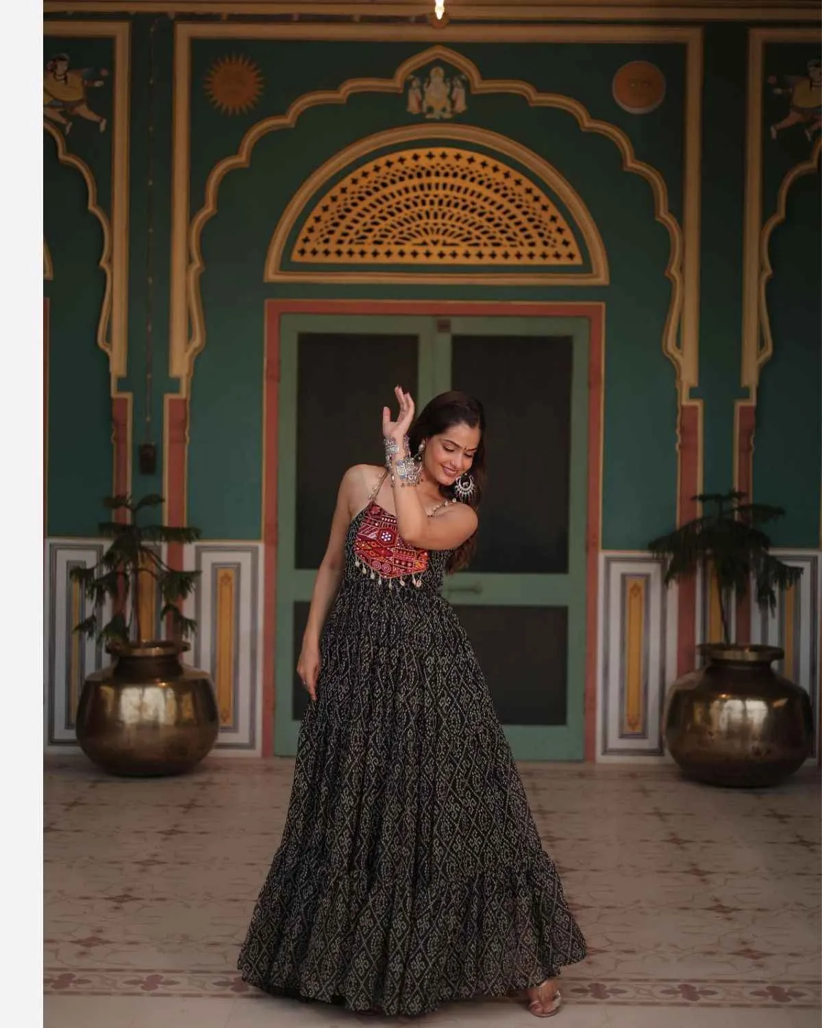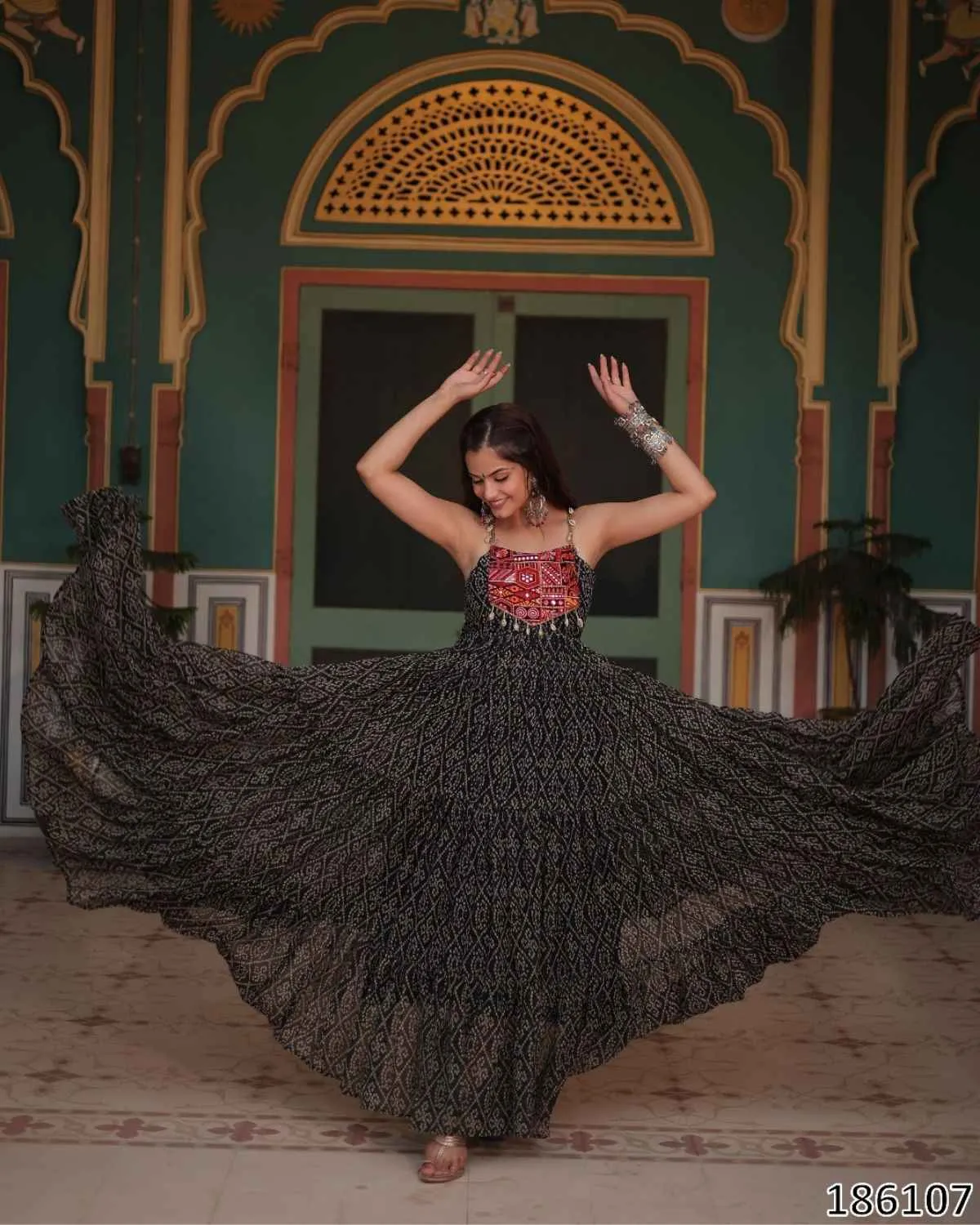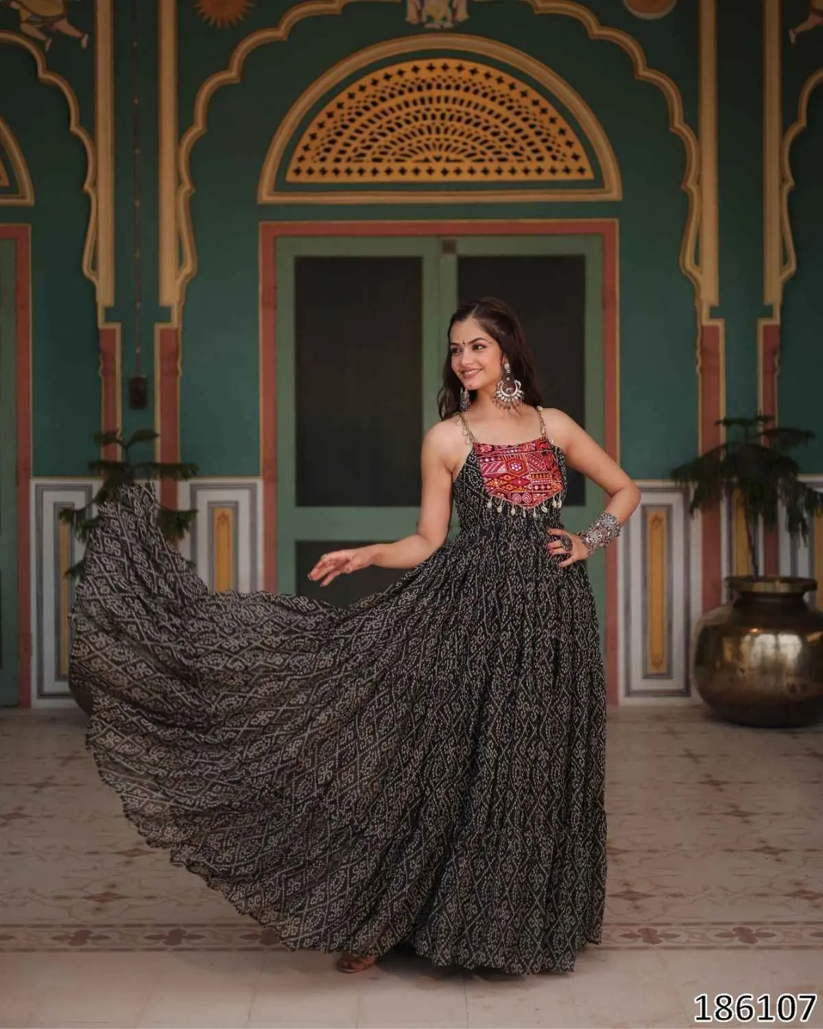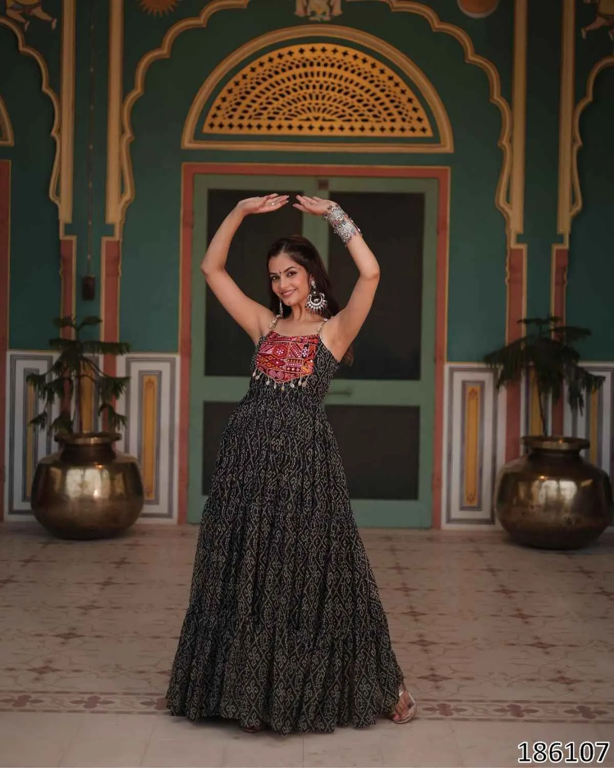 Step into timeless grace and traditional splendor with QuinKart's Festive Ready: Bandhani Print Faux Georgette Gown with Kutchi Patchwork. This exquisite long gown is designed to make you shine at weddings, festivals, and all celebratory occasions, making it a perfect addition to your ethnic wear collection. The gown is crafted from premium Faux Georgette fabric, offering a light, airy feel and an incredibly elegant drape. The highlight is its grand 12-meter flair, which creates a regal and flowing silhouette, ensuring you make a memorable entrance wherever you go. Adorned with vibrant Bandhani Print work, this gown beautifully captures the essence of traditional Indian textiles. Adding to its unique charm is the intricate Kutchi Patchwork on the yoke, which features beautiful mirror work. This authentic detailing reflects exquisite craftsmanship and traditional artistry, making each piece a unique statement. For your ultimate comfort, the gown comes with a full Cotton lining extending all the way to the bottom. This ensures breathability and a comfortable feel, allowing you to enjoy your celebrations without any discomfort. This stunning gown is available in 3 rich colors: Maroon, Black, and Purple. It comes in L size (40 Inch Stitched), with the flexibility for users to easily adjust it from 38 inches (M) to 44 inches (XXL) for a perfect, custom-like fit. The sleeveless design adds a contemporary touch, highlighting the intricate bodice. Elevate your festive wardrobe with this ready-to-wear Bandhani Print gown, combining traditional designs with modern comfort. Experience the perfect blend of elegance and cultural heritage, only at QuinKart.